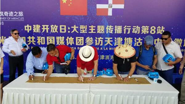 在活动现场,记者们纷纷拿着“中建蓝宝”,与中建员工合影,并在留言簿上写下了对中国建设发展成就的赞美、对多中两国人民友谊长存的祝福。